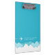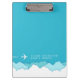Un porte - bloc turquoise brillant et dynamique adapté au pilote de ligne, à l'instructeur de vol ou à l'ingénieur aéronautique. Il est décoré dans un style turquoise et lumineux, avec un avion miniature qui survole les nuages sur le bord inférieur. A côté de ce plan miniature et au-dessus des nuages se trouve le nom du destinataire en blanc. Il fonctionne comme un cadeau amusant et réfléchi pour quelqu'un qui travaille ou aime l'industrie de l'aviation.
