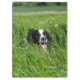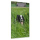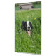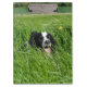 Joyeux Collie noir et blanc jouant dans l'herbe longue.
