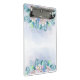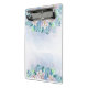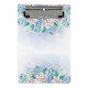 Un porte - bloc à la décoration florale est exposé dans un gros plan lumineux. La porte - bloc est principalement blanche, avec un motif floral à l'aquarelle ornant les bords supérieur et inférieur. Les fleurs sont restituées dans des tons pastel doux rose et vert, avec des détails délicats suggérant un effet peint à la main. Le clip métallique en haut est argenté et apparaît nouveau, contrastant avec le doux aspect organique du design floral. L'arrière - plan est un dégradé de bleu clair et de blanc, donnant l'impression d'une source lumineuse douce et diffuse. L'ensemble est propre et moderne, avec une touche de fantaisie des éléments floraux. L'image est probablement destinée à l'affichage de produits ou à des fins promotionnelles.