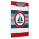 Design nautique avec décoration de voilier en forme ronde sur bleu, rouge et blanc rayé arrière - plan