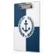Nautical themed design with anchor and laurel wreath decoration over blue and white geometric background