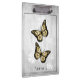 Joignez des notes et des rappels sur une surface sécurisée avec un Porte - bloc Floral à papillon d'or personnalisé. Le design porte - bloc présente une paire de papillons vibrants reposant sur une vigne florale blanche contre un arrière - plan gris clair. Autres cadeaux disponibles avec ce design ainsi qu'une variété de couleurs.