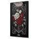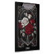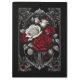 Des roses rouges et gris-blanc dans un vase, retenus dans un cadre gris en fer forgé sur un arrière - plan noir, créent un joli porte - bloc goth.