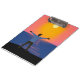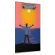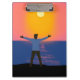 Salutation au soleil. Un homme est debout sur une plage face à la mer ouverte et salue le soleil jaune avec des bras levés.