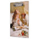 Vintage illustration of a lovely young girl praying before having breakfast in bed while a cute little kitten and a small dog are watching, eager to catch a piece of food. Oil on canvas by Charles Burton Barber.