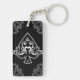 Porte - clé chanceux comportant une illustration vintage fleurie noire et blanche d'as de pique avec des embellissements floraux baroques.