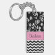 Le porte - clé moderne et à la mode floral et de chevron de motif comporte des rayures blanches de chevron et un motif floral blanc sur texte initial, nommé ou autre d'arrière - plan noir et d'un cadre d'accent de rose en pastel pour un votre sur l'avant et le dos. Montrez votre personnalité avec ces amusement et porte - clé à la mode. Fait un grand cadeau pour toutes les occasions. Cliquez sur la "personnaliser il !" boutonnez pour changer la taille de la police, la couleur de police, le style de police et les plus !