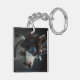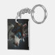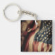 Ce porte - clé patriotique a un drapeau rustique d'un côté et un chien patriotique avec l'oncle Sam casquette.