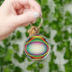 Ce porte - clé présente un motif multicolore aux couleurs psychédéliques vives entourant une structure centrale en forme d'oeuf. Il ressemble à un imaginaire d'un vaisseau spatial alien prêt à enlever un tremblement de terre.