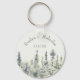 Personnalisez ce porte - clé avec vos propres noms ou informations pour créer des faveurs de mariage spéciales pour votre mariage de chalet de montagne ou un cadeau personnalisé spécial avec un thème boisé. Décoré dans un style simple mais élégant, avec un accent illustrant une forêt de pins d'aquarelle ou à feuillage persistant dans les tons vert sauge, gris et vert pâle. L'aquarelle douce a une qualité calme et paisible, qui vous rappellera que le brouillard se lève sur un vitrage boisé. Le lettrage classique et élégant dans un vert à la sauge foncée coordonné indique les noms de la mariée et du marié et la date du mariage.