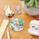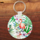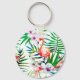 OEuvre d'art à thème tropical d'un flamand rose et de plantes de jungle tropicale verte avec fleurs d'hibiscus et palmiers contre un arrière - plan blanc neutre. Une oeuvre d'art amusante et colorée.