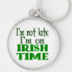 Un porte-clés avec la mention Je ne suis pas en retard, je suis à l'heure irlandaise, avec des lettres à entrelacs celtiques. Personnalisez-le pour ajouter votre nom ou un message personnalisé.