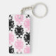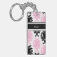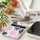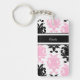 Porte - clés de concepteur avec les noms et le motif noir de damassé et le texte des textes que vous pouvez personnaliser avec n'importe quel nom, les initiales, ou le message blanches et roses. Conçu comme porte - clés pour des femmes ou porte - clés pour des filles, dans une conception bilatérale d'amusement qui vous laisse porter vos clés de maison ou clés de soin dans le style.