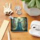 Une belle fée habillée d'une robe turquoise coulante et d'un collier de pierres turquoise, turquoise et sainte dans ses longs cheveux turquoise et ses ailes irisées en forme de libellule tenant une branche sainte se dresse dans une forêt magique entourée d'herbes, de rochers et d'arbres couverts de vignes.