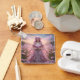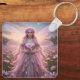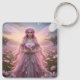 Une belle fée habillée d'une robe rose fluide et d'un collier composé d'opales et de fleurs de cosmos dans ses longs cheveux roses et ses ailes de libellules rose pâle tenant une fleur de cosmos rose se dresse dans un champ magique de fleurs de cosmos entourées de bulles contre un ciel de l'après-midi.
