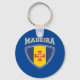 Le drapeau national de Madère est infusé en forme de bouclier et placé sous le nom du pays.