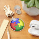 Promouvoir la Sensibilisation sur l'autisme. Des pièces de puzzle rouge, jaune, bleu et vert forment une roue à pincement colorée au milieu de ce design audacieux. Il est parfait sur les boutons, les t-shirts et plus encore.