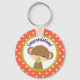 Bébé félicitations porte - clé. Conçu avec un mignon petit singe tenant une sucette dans sa bouche à l'intérieur d'un cercle avec une bordure verte d'olivier. L'arrière - plan est un motif à pois orange et blanc.
