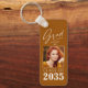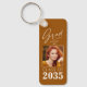 Un nouveau porte - clé à la mode, à deux côtés, en aluminium robuste, Graduate - porte-clés avec votre photo à l'avant. Tous Personnalisés, avec "Grad" en élégant script d'encre de calligraphie avec "Class of, The Year, School Name & Your Name" dans la typographie moderne. La photo du diplômé est habillée d'un délicat dégradé. Le texte et la garniture sont blancs avec l'arrière - plan dans une couleur de rouille orange brûlée moderne. Si vous le souhaitez, modifiez facilement la couleur arrière - plan à la couleur primaire de votre école. L'idée cadeau parfait pour les étudiants du secondaire, du collège et de l'université.