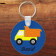 Camion de jouets en forme de dessin animé. Porte - clés personnalisés. Arrière - plan bleu. Modifiez le nom pour personnaliser ces porte - clés. Idée cadeau pour les enfants.