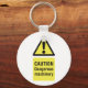 A yellow sign that says caution dangerous machinery. This design looks really effective on these Keychain