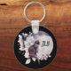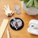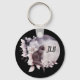 Un porte - clé avec une aquarelle représentant un chat noir et un bouquet floral violet clair et rose. Devant une grande lune. Design et magique.