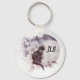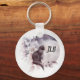 Un porte - clé avec une aquarelle représentant un chat noir et un bouquet floral violet clair et rose. Devant une grande lune. Design et magique.