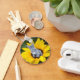 Ce porte - clé coloré est accompagné d'un mignon chiot de Bulldog, gris, bleu, français, assis dans un tournesol géant jaune.