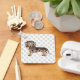 Illustration originale de Destei d'un mignon chocolat à cheveux courts brun et tan dapple couleur robe chien de race Dachshund. Il y a aussi une zone de texte personnalisable pour un nom de l'autre côté. L'arrière - plan a un motif d'empreintes de pattes de chien gris.