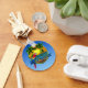 Key West beach sunset painting with palm trees, round bamboo frame, et a colorful parrot.