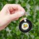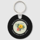Bague de touche de logo avec modèle de code QR à l'arrière. Ajoutez également deux lignes de texte incurvé. Noir avec une formulation blanche.