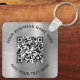 Porte - clé promotionnel simple et élégant pour votre entreprise ou organisation avec un arrière - plan métallique en argent faux brossé. Ajoutez votre code ou logo QR et deux lignes de texte customisé, comme le nom de votre entreprise, le slogan, merci ou laissez vide.