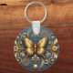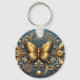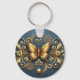 Une représentation artistique d'un papillon doré orné entouré de fleurs élégantes et de volutes ornementales sur un fond bleu contrasté, renforçant les thèmes de luxe, d'élégance et de décoration.