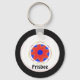 Un frisbee blanc aux motifs rouges et bleus sur un arrière - plan noir. Le mot 'frisbee' peut être modifié ou supprimé.