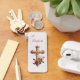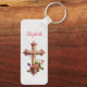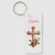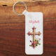 Porte - clé avec une jolie illustration représentant une simple croix en bois recouverte de fleurs roses et de feuilles verts.