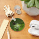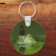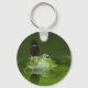 A cute green frog sitting on his lily pad in a pond, with face poking out above the surface of the water. A curious butterfly sits on his nose. These cute critters look like they could be best friends