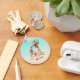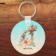 Un porte - clé avec un dessin mignon en aquarelles d'une maman et d'une petite girafe. La girafe mère se repose la tête au-dessus de la petite girafe, aimante et adorable. Joli bouquet de fleurs d'aquarelle rose, jaune, vert placé sous cette paire de chatons. Un arrière - plan dégradé de bleu turquoise délicat qui se fond dans une couleur sable brun.