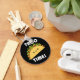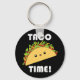 Un porte - clé mignon avec un yummy taco au boeuf haché, à la laitue, aux tomates et au fromage, souriant sur un arrière - plan noir entre les mots "Taco Time !" en blanc de la police Bahaus 93. Un cadeau mignon pour les amateurs de taco, de pop art japonais, et les fans de kawaii humoristique !