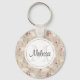 Une porte - clé avec un motif de style nordique mignon. Pins d'hiver, ours, rennes et écureuils. Couleur brun clair. Un cercle blanc superposé avec votre nom et votre monogramme initial à l'intérieur.
