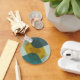 A modern, abstract geometric poster design featuring overlapping translucent shapes. The composition is divided into four quadrants with textured, muted background colors (soft teal, light sage, dark charcoal/slate). Central to the design are a large, vibrant mustard yellow curved shape and several partially visible, translucent teal/grey circles and rectangles. The artwork is characterized by its sharp lines, clean edges, and contemporary color palette, creating a sense of depth and dynamic movement through the interplay of transparency and opaque forms.