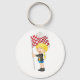 Un dessin d'une fille debout tenant un drapeau à damiers rouge et blanc. Cette conception semble vraiment efficace sur ce Porte - clé