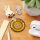 Cette conception bouddhiste de fleurs de Lotus a des traits de grunge circulaire jaune et orange avec Om Mani Padme Hum dans un élégant texte environnant. Dans le cercle brun intérieur est plus grand Om Mani Padme Hum texte. Dans le centre avec un fond de rayons éclairés est une fleur de Lotus, qui représente l'éveil à la réalité spirituelle de la vie. Le symbolisme de la fleur de Lotus est qu'une personne peut s'élever au-dessus de la laideur et de la souffrance du monde. Om mani padme hum est un mantra du bouddhisme tibétain qui invoque l'attention et les bénédictions de Chenrezig, l'incarnation de la compassion.