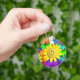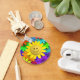 Fleur adorable et mignonne de visage heureux jaune reposant sur un lit de fleurs aux couleurs néons vives. Coloré et gai.