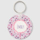 Une porte - clé avec un joli motif floral. Composé de fleurs irrégulières roses et violettes dans un style rétro des années soixante super. Petits coeurs bleus pâles, poivrez l'arrière - plan sur un fond bleu pâle. Personnalisez avec votre nom au centre.