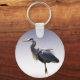 Ce porte - clé présente le Grand Héron Bleu, un grand échassier de la famille des hérons Ardeidae, commun près des rives de l'eau libre et dans les zones humides. Il est le plus grand héron nord-américain. Parmi les caractéristiques notoires, on trouve des plumes de vol latinées, des cuisses brun-rouge et une bande rouge-brun et noire appariée sur les flancs, un cou gris rouillé, avec du noir et du blanc qui s'étire sur le devant, une tête plus pâle, avec un visage presque blanc, et une paire de panaches noirs qui courent juste au-dessus de l'oeil jusqu'à l'arrière de la tête. Les plumes du cou inférieur sont longues et ressemblent à du panache. Parce que c'est la saison de reproduction, il a aussi des panaches sur le bas du dos et un bec orange. Il se tient dans une eau peu profonde et ses plumes sont rétro-éclairées par la lumière du soleil.