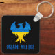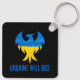 Un design porte - clé inspirant qui fait écho à la résilience du peuple ukrainien, présente une silhouette d'oiseau phénix dans les couleurs bleu et jaune du drapeau ukrainien avec le texte "L'Ukraine va s'élever" en caractères désespérés sur arrière - plan noir