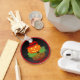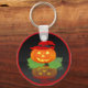 C'est une image d'un Jack-o'-lantern tout habillé. Un citrouille orange avec un casquette aux sorcières rouges est assis sur un lit de feuilles verts. La Jack-o'-lantern est éclairée par des yeux brillants et un sourire. Un fond noir a également été ajouté pour que vous puissiez voir sa réflexion. Une bordure rouge a été ajoutée. Ces porte - clés sont disponibles dans des styles et des tailles variés.