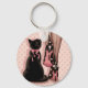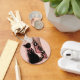 Chat noir au côtés d’une élégante jeune femme en talons aiguilles. Illustration vignette style vintage sur fond rayé rose et gris foncé réalisée par l’artiste Maryline Cazenave.