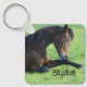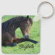 Un porte - clé avec une belle photo représentant un beau cheval de baie brun posé dans l'herbe, à l'air paisible et content.