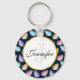 Un porte - clé avec un beau motif. Papillons aquarelles, peints dans des couleurs pastel, rose, violet, bleu, jaune et vert. Arrière - plan d'aquarelle bleu foncé. Placez votre nom et votre lettre monogramme à l'intérieur d'un cercle blanc avec une bordure en feuille d'or.